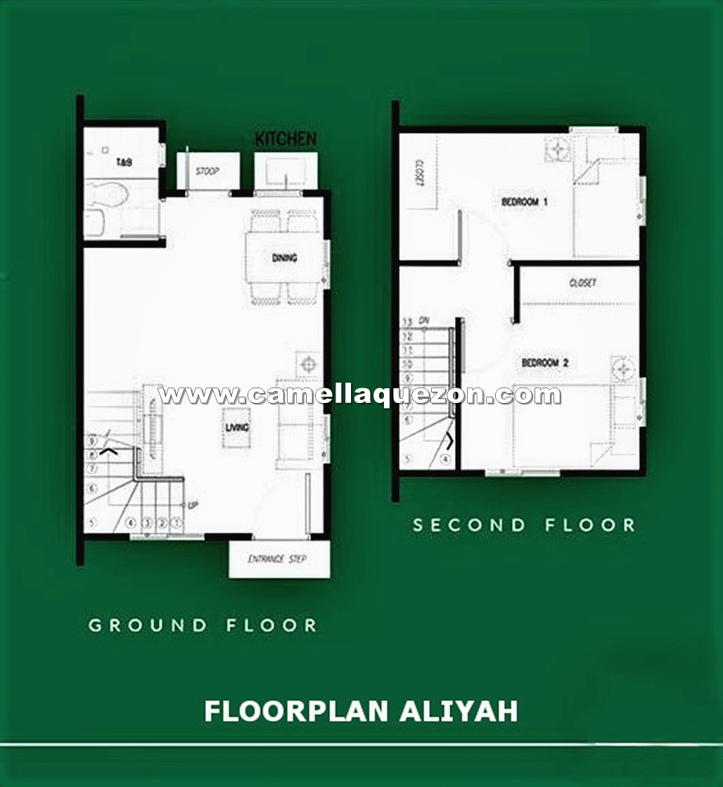Aliyah has a lot area of 80 and a house area of 46 sqm. It's a single attached house with two bedrooms, one toilet and bath, a living area, dining area, kitchen, a carport, and a laundr/service area.